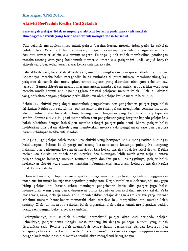Karangan Isi Masa Cuti Doc Www Bmspm Net Contoh Karangan Spm Aktiviti Berfaedah Ketika Cuti Sekolah Sesetengah Pelajar Tidak Mempunyai Aktiviti Course Hero