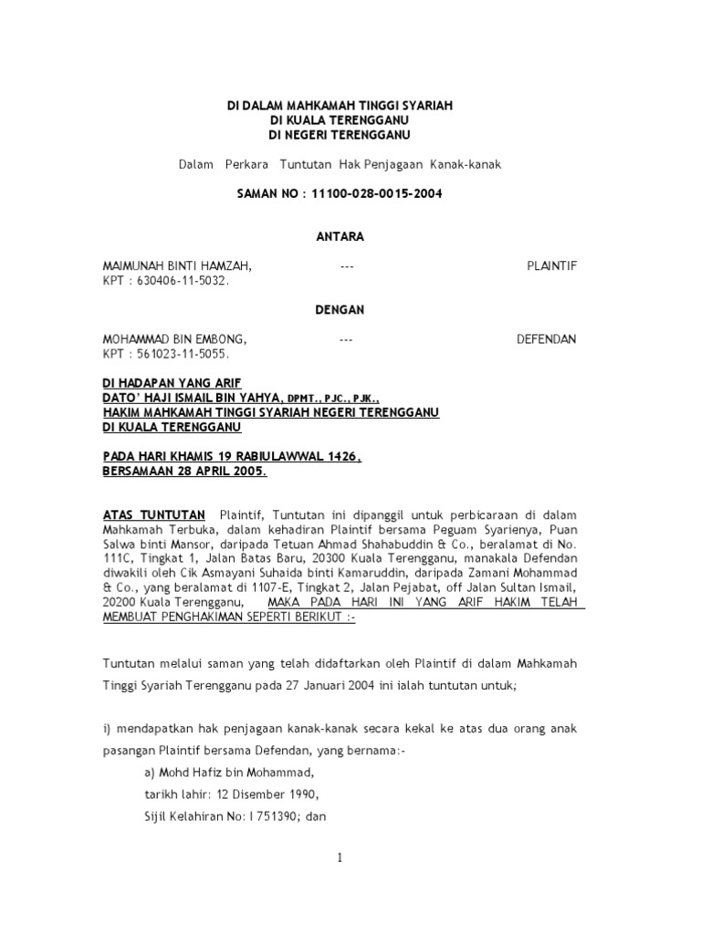 Pdf Tuntutan Hadhanah Contoh Najihah 84 Academia Edu