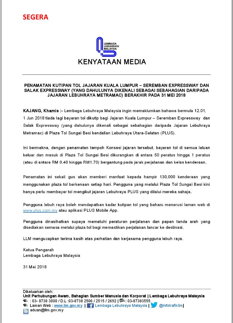 Terdiam Dedak Mulai 12 01 Malam Ni Tol Dihapuskan Di Jajaran Kl Seremban Expressway Dan Salak Expressway Kabarmalay3 Blogspot Com Kabar Malay 3