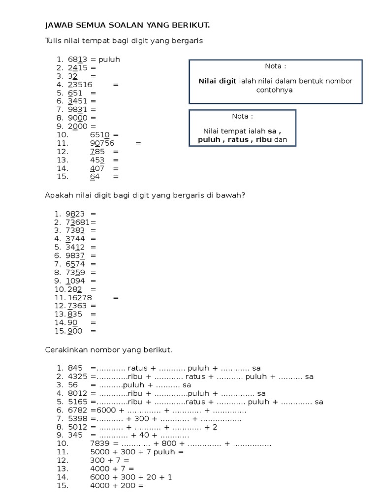 Latihan Nilai Tempat Dan Nilai Digit Tahun 1