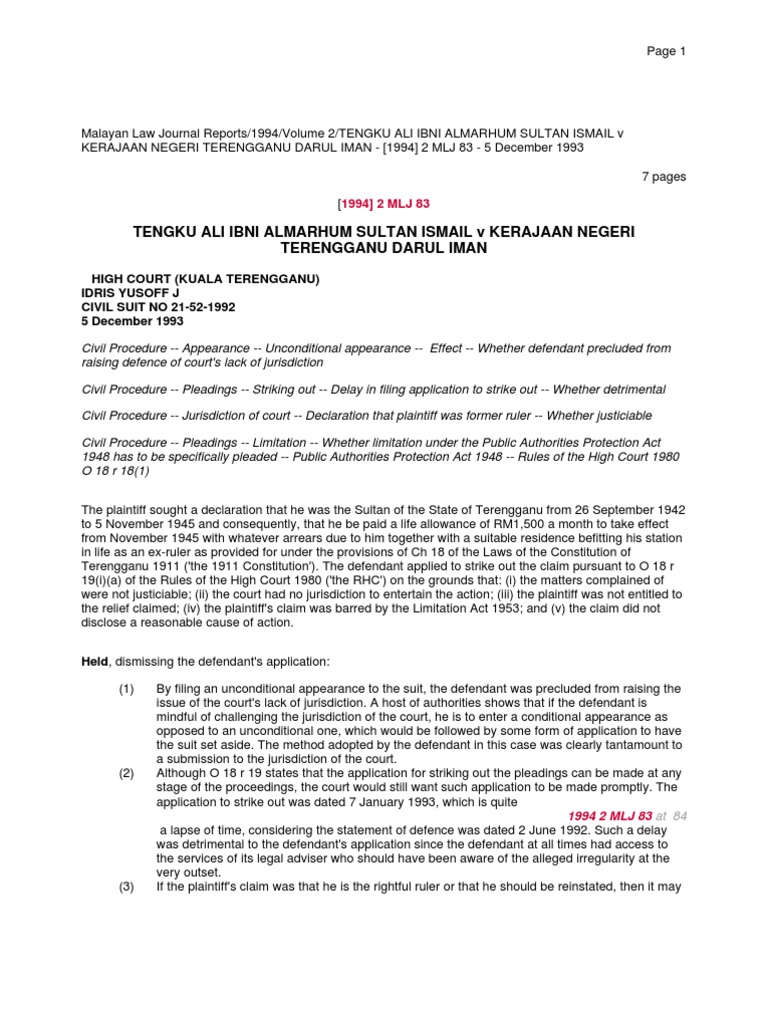 Tengku Ali Ibni Almarhum Sultan Ismail V Ker Pleading Cause Of Action